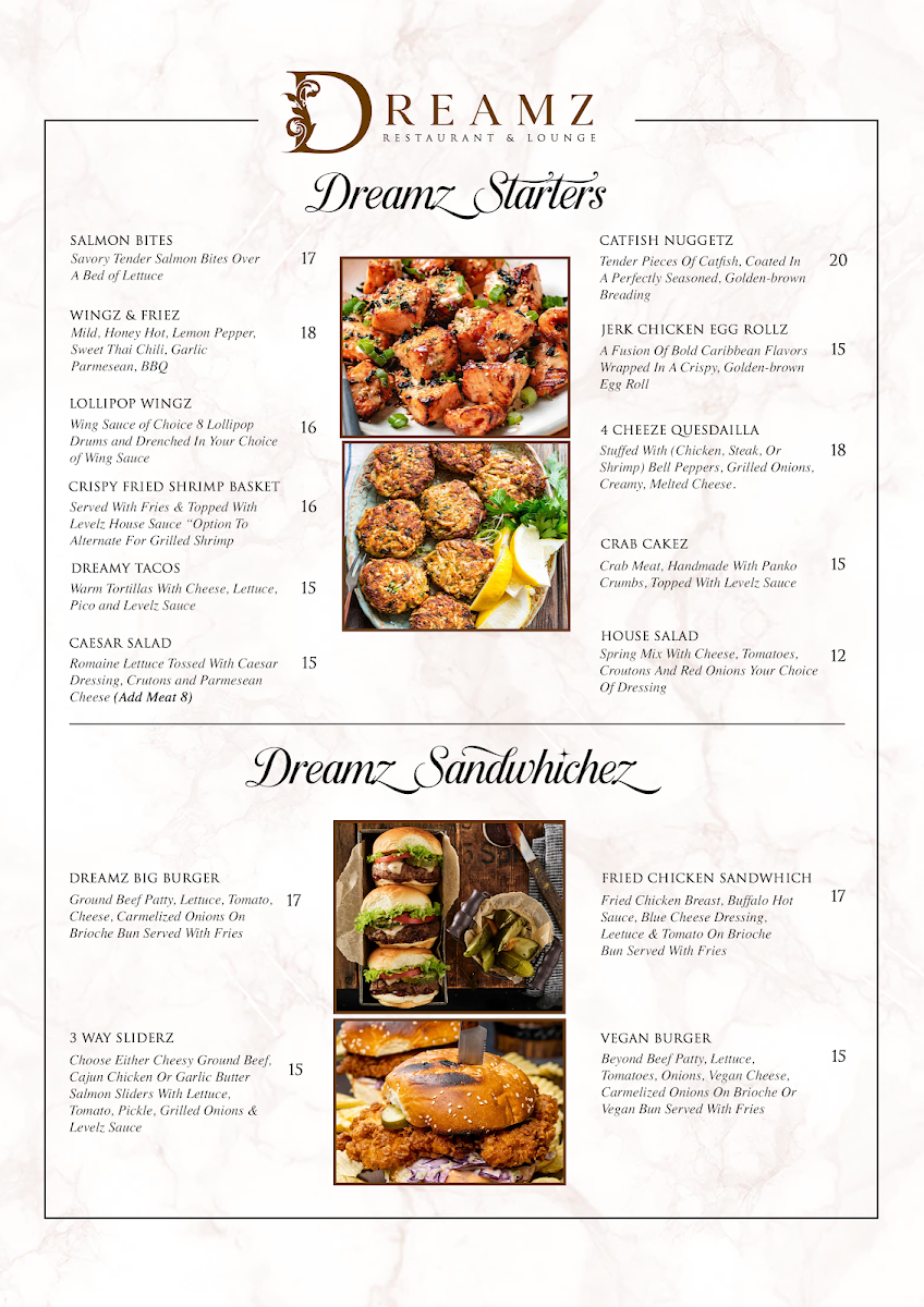 Welcome to Dreamz Restaurant And Lounge, a vibrant culinary haven located in Duluth, GA. Here, the menu is an enticing blend of flavors catering to diverse palates. Start your meal with irresistible appetizers like Salmon Bites and delicious Lollipop Wings, perfect for sharing. As you dive into the entrees, savor the exquisite Impossible Burger or the succulent Ribeye Steak, each showcasing remarkable craftsmanship and fresh ingredients.